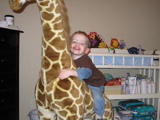 For those of you who have seen Sean's room, you know there is a "life size" giraffe that goes with his safari theme. What you may not know, is Scooby (also referred to with many other not-so-nice names) is deathly afraid of this stuffed animal. Now mind you, this is also the dog who is afraid of his own shadow and balloons, but also prefers ice cubes over dog treats. I'm telling you, he's not all there. Anyway, Sean has just starting really having fun with the giraffe, and we think it's great! Here are a couple of pictures of him hugging/playing/attacking/jumping on/climbing on and falling off of (with Daddy there to catch of course) his giraffe.